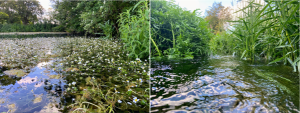 Figure 1 – Water crowfoot on a restored ponds (left) and vegetation and fast flowing water in the main channel (right)